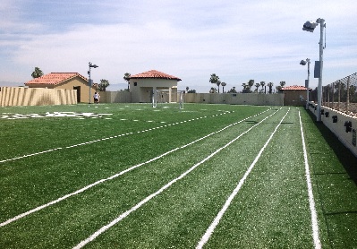There is an elevator-accessible soccer field surrounded by a 3-lane